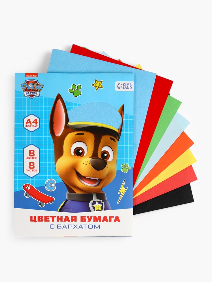 Цветная бумага с бархатом А4, 8 листов, 8 цветов, 80 г/м², «Щенячий патруль»