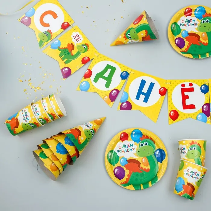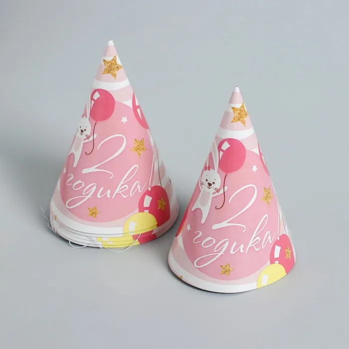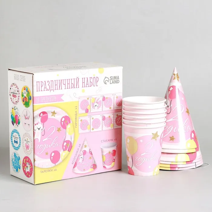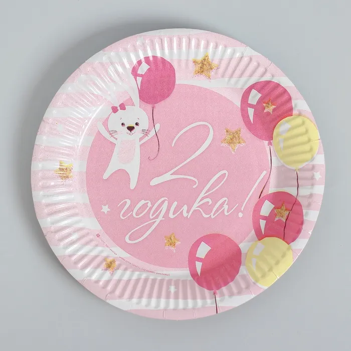 Набор бумажной посуды «С днём рождения. 2 годика», 6 тарелок, 6 стаканов, 6 колпаков, 1 гирлянда, цвет розовый — Характеристики