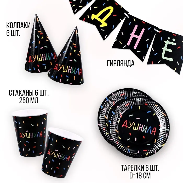 Посуда бумажная одноразовая «Душнила», 6 тарелок, 1 гирлянда, 6 стаканов, 6 колпаков