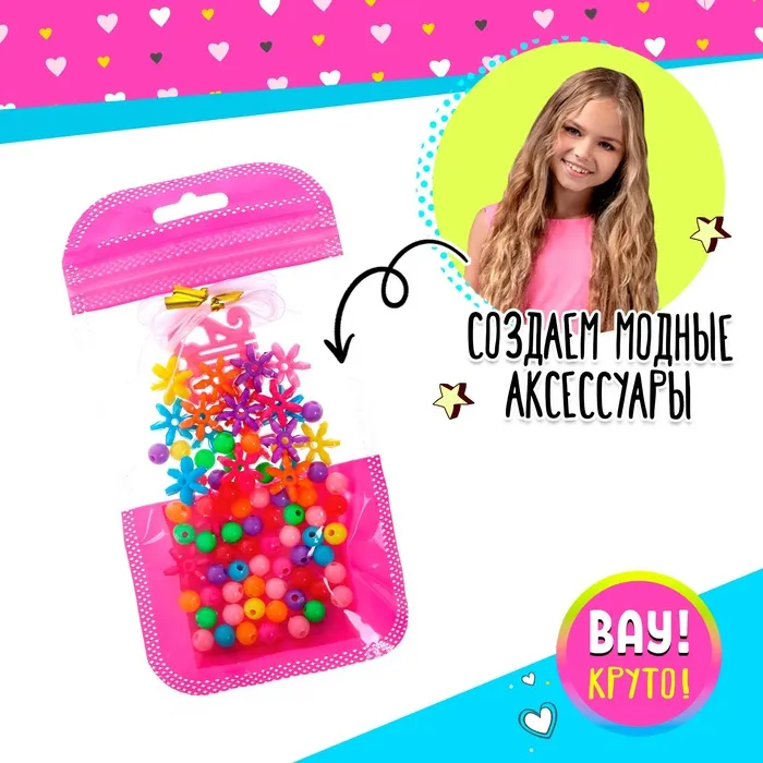 В наборе есть всё необходимое для творчества: разноцветные бусины, из которых можно делать аксессуары в разных стилях.