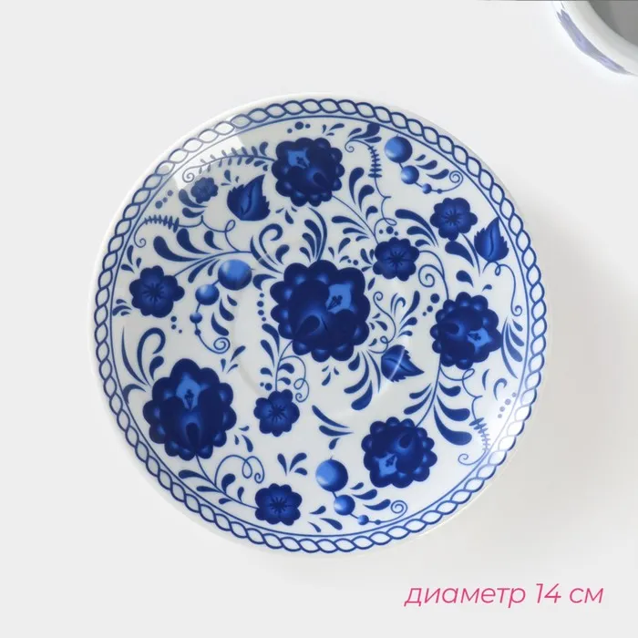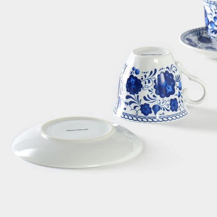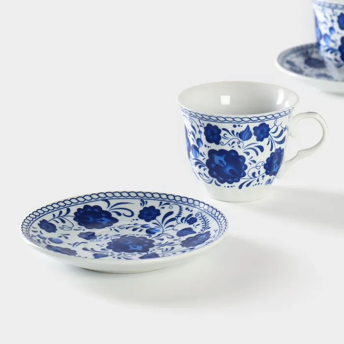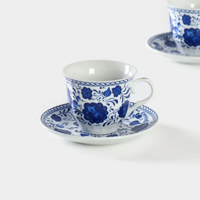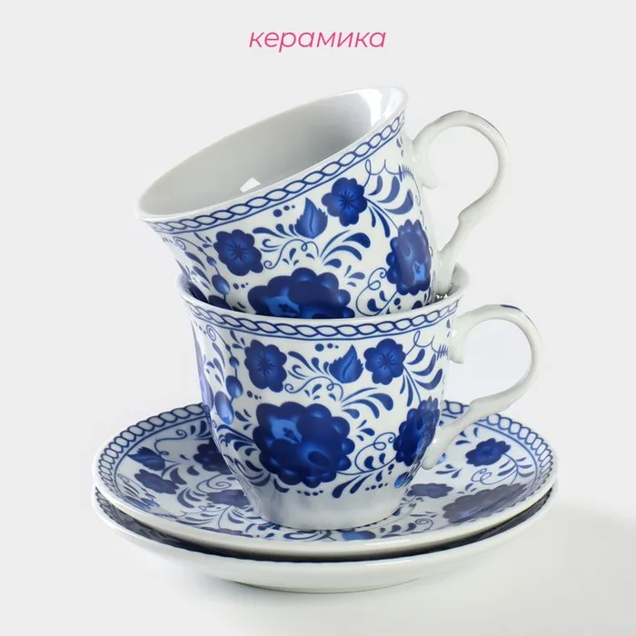 Набор чайный Доляна «Русский узор», 4 предмета: 2 чашки 210 мл, 2 блюдца d=14.1 см, керамика, синий — Характеристики