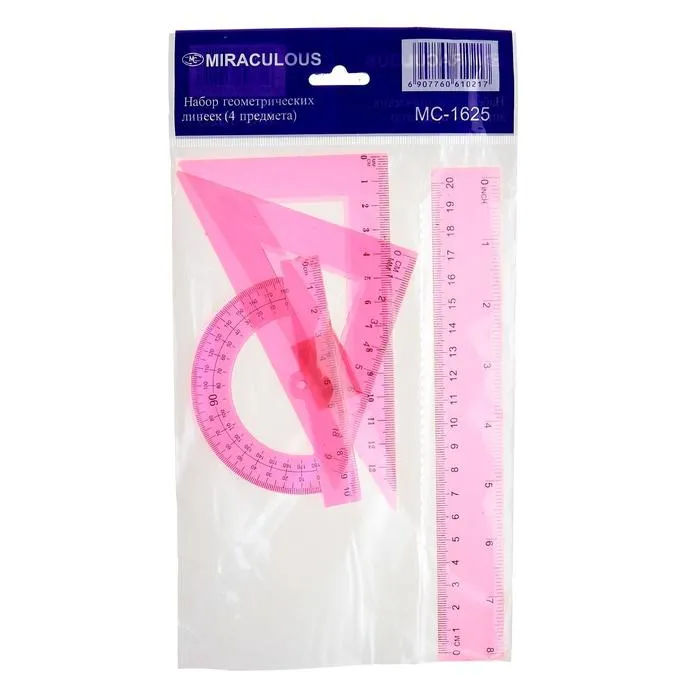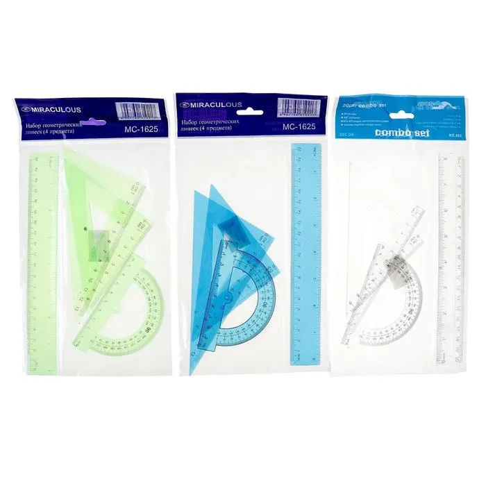 Набор чертежный, прозрачный, на блистере, 4 предмета (линейка 20 см, 2 угольника, транспортир), МИКС — Характеристики
