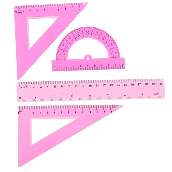 В комплекте: линейка 20 см, 2 треугольника, транспортир.