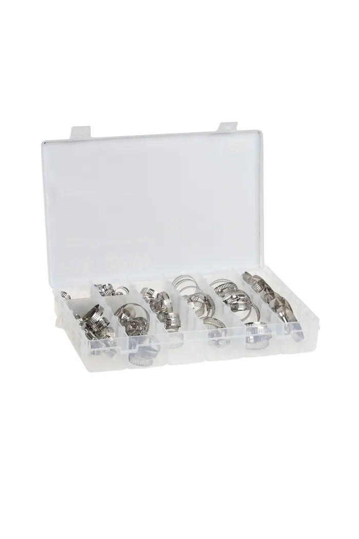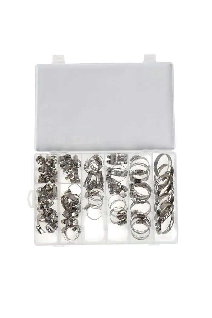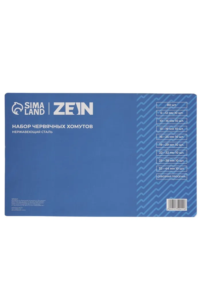 Набор червячных хомутов ZEIN engr, сквозная просечка, от 6 до 44 мм, нерж. сталь, 80 шт. — Характеристики