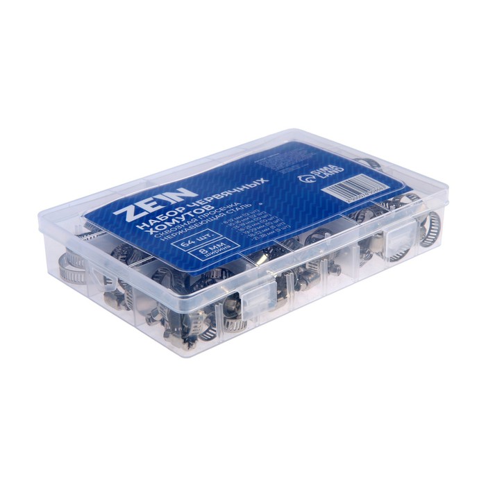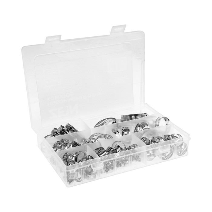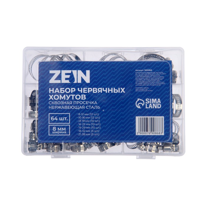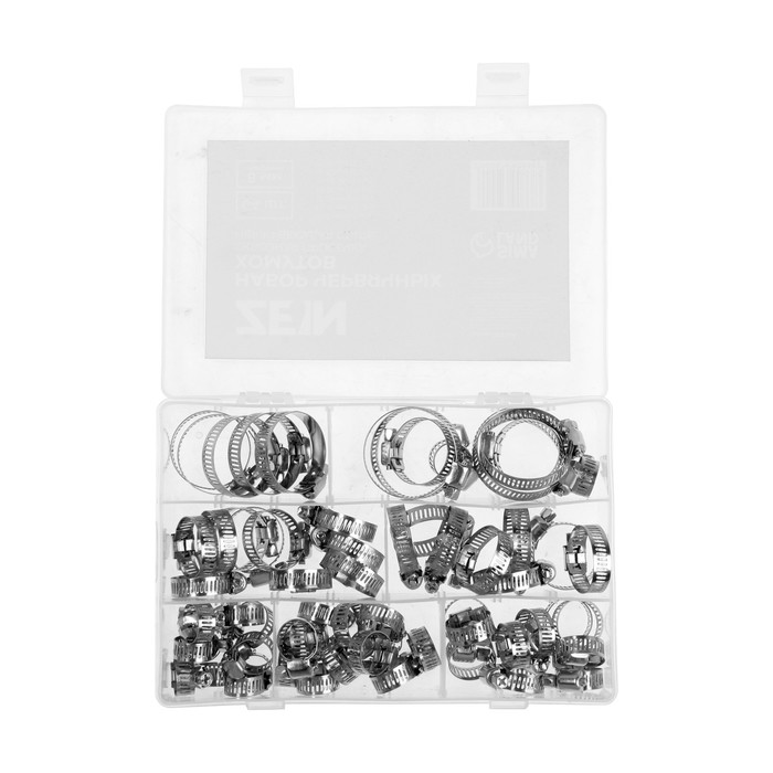Набор червячных хомутов ZEIN engr, сквозная просечка, от 8 до 38 мм, нержавеющая сталь, 64 шт. — Характеристики