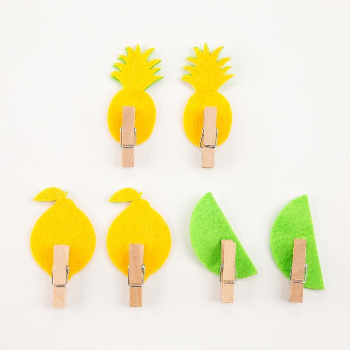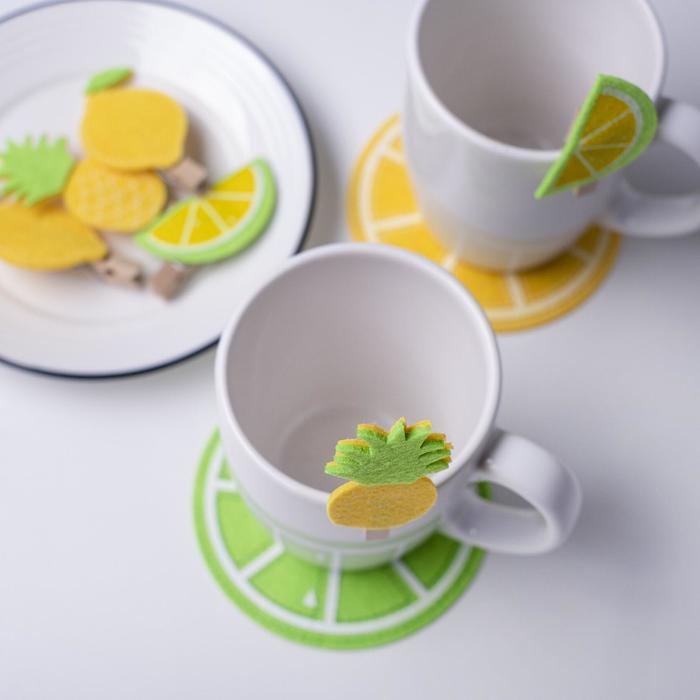 Эти яркие фигурные прищепки превращают обычные бокалы в элемент декора. Шесть солнечно-жёлтых фруктов из мягкого фетра на деревянной основе создают летнее настроение в любой сезон. Они легко крепятся на стекло, отмечая гостевые места на праздничном столе или просто добавляя уютной детали в повседневной сервировке.