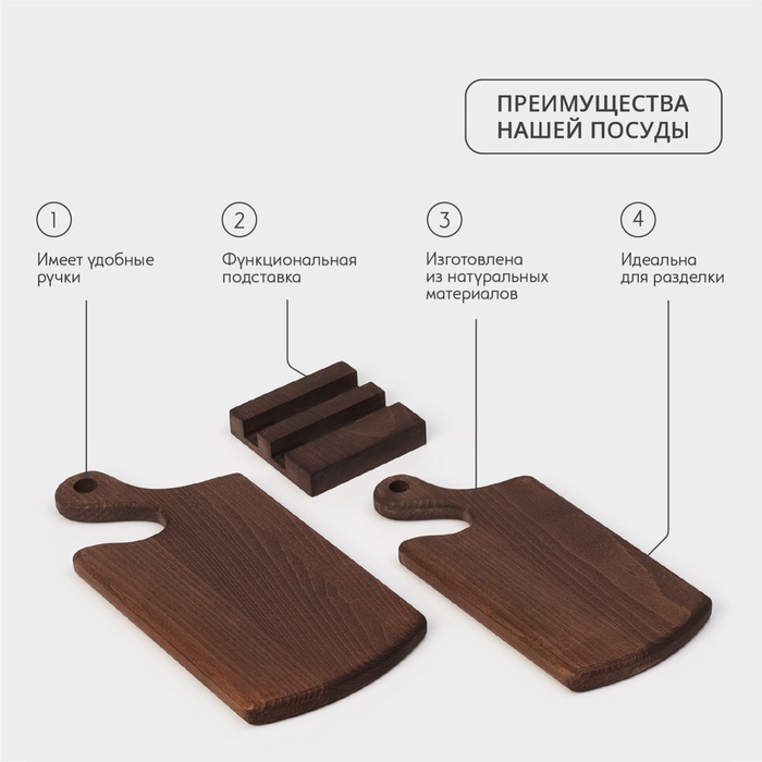 В этом наборе Вы получите две доски различных размеров - от небольшой для фруктов и овощей, до более крупной для больших кусков мяса. А так же подставку для досок.