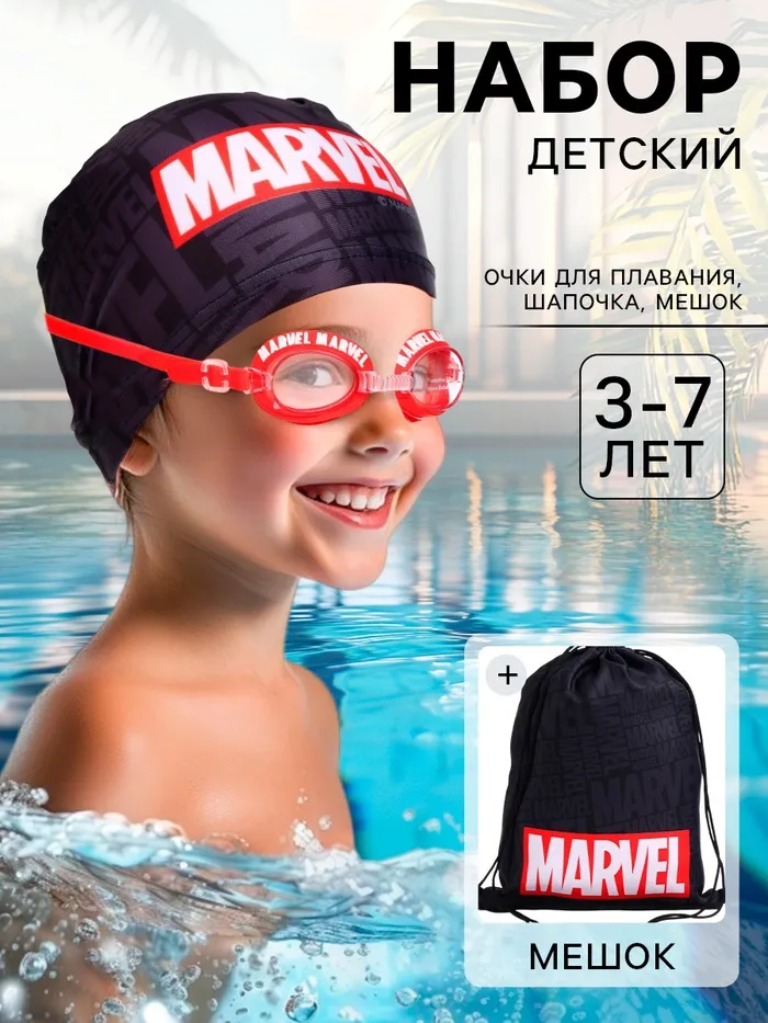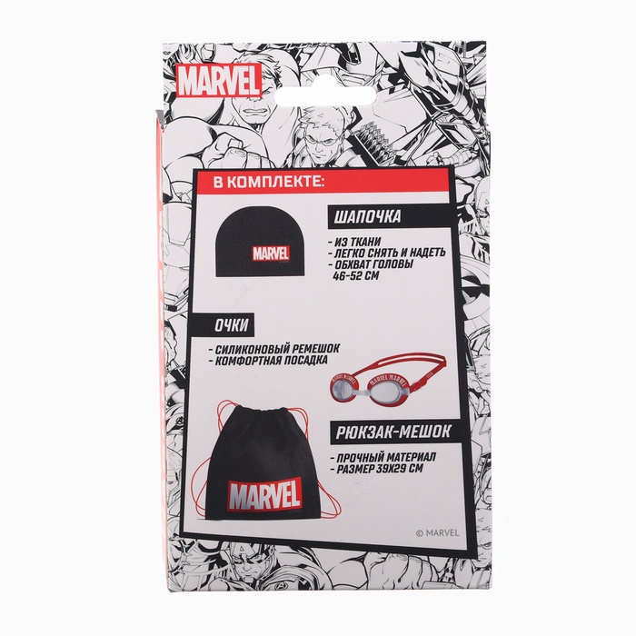Набор детский для купания «Мстители», шапочка, очки для плавания, мешок — Характеристики