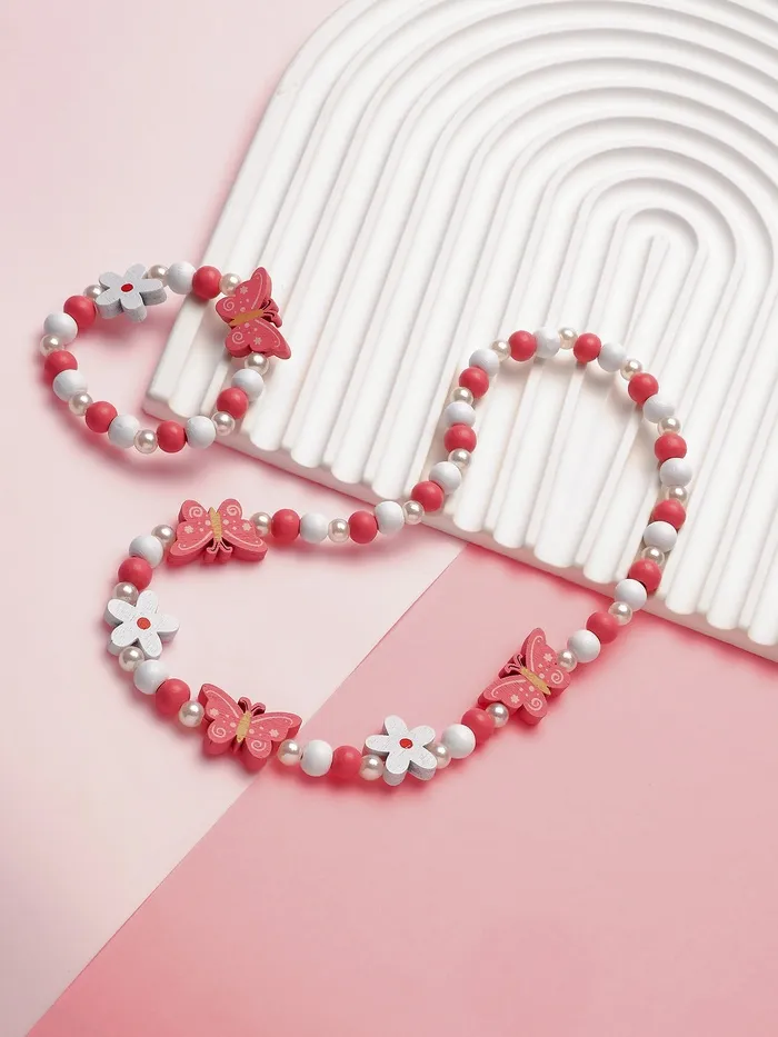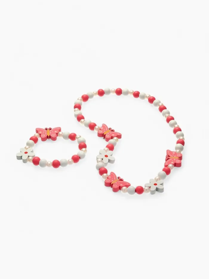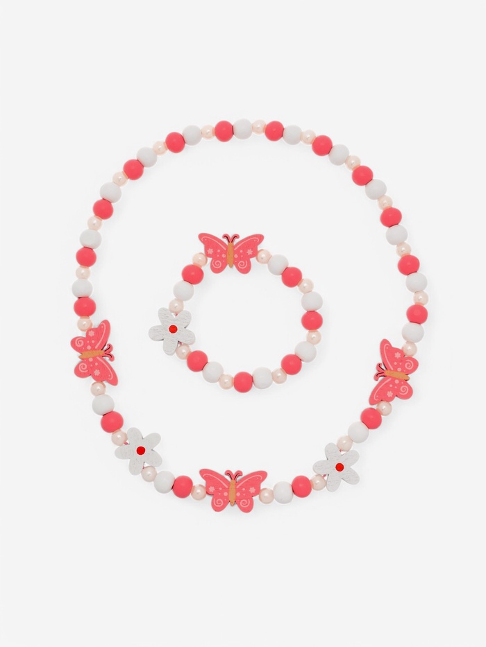 Яркий и весёлый набор из двух украшений — бусы и браслет — создан специально для маленьких модниц, которые любят играть с цветом и фантазией. В основе набора — сочетание натурального дерева и лёгкого пластика, украшенное красочными бабочками и цветами, что придаёт аксессуарам неповторимый шарм и лёгкость.