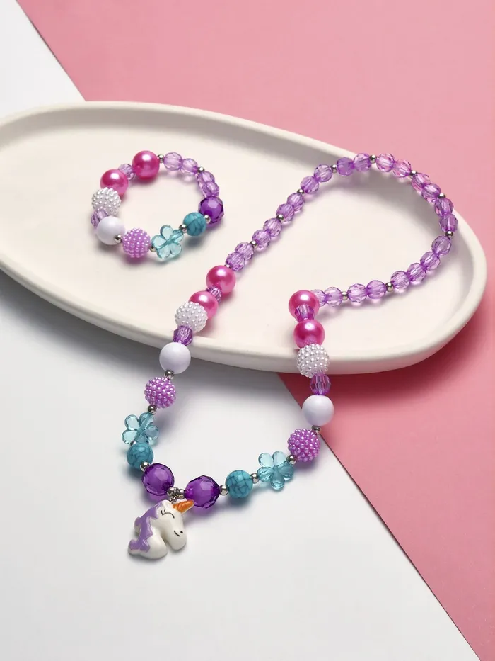 Фиолетовый набор из бус и браслета с изображением единорога в цветах — это яркое и стильное украшение для юных модниц, которое привнесёт в образ нотки волшебства и сказочного настроения. Выполненный из прочных и безопасных материалов — пластика, акрила и полистоуна, комплект сочетает в себе лёгкость, комфорт и долговечность.
