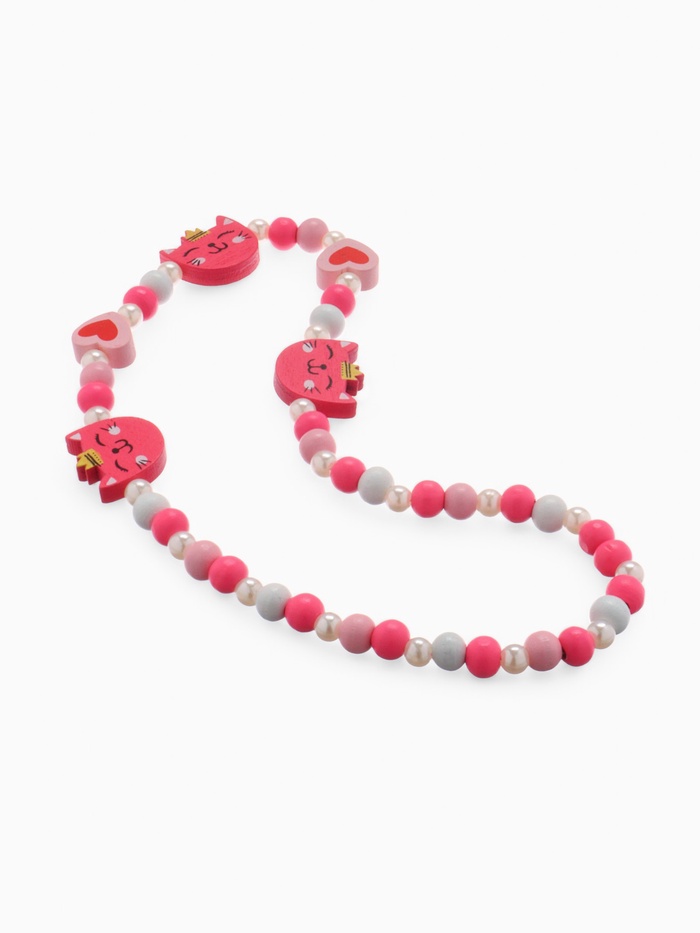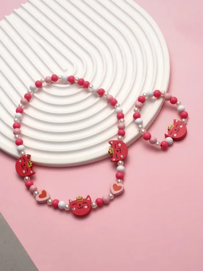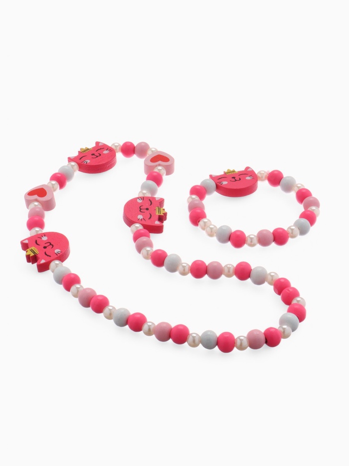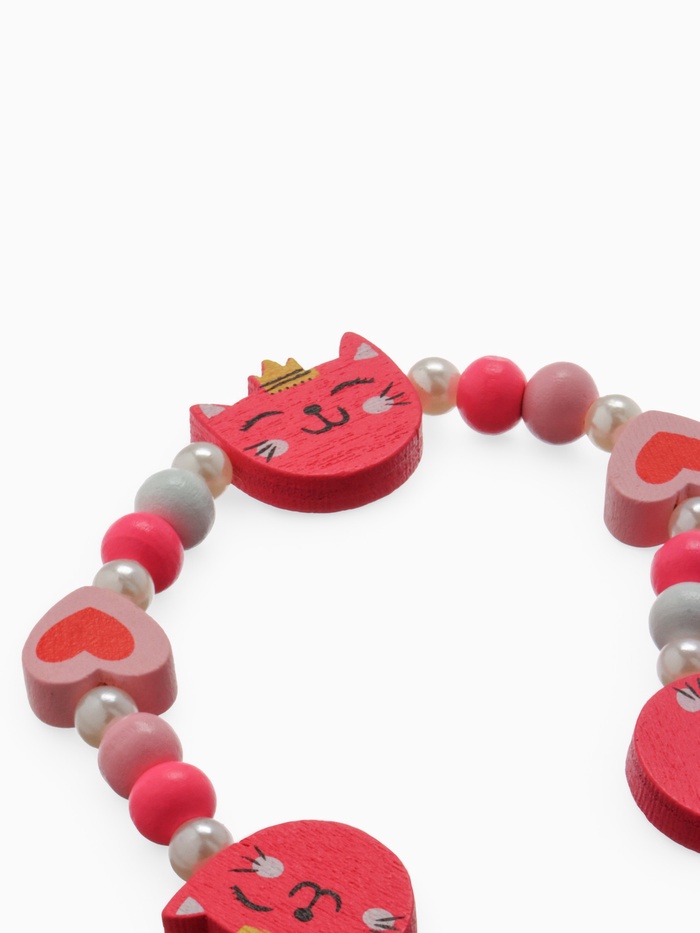 Нежный и яркий комплект из бус и браслета с очаровательным мотивом кошечки в короне — это идеальный аксессуар для маленьких модниц, стремящихся подчеркнуть свою индивидуальность и добавить в образ долю сказочного волшебства. Выполненный из безопасных материалов — дерева и пластика, набор сочетает в себе лёгкость и прочность, а красно-розовая цветовая гамма привлекает внимание и дарит позитивные эмоции.