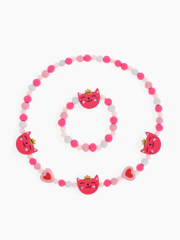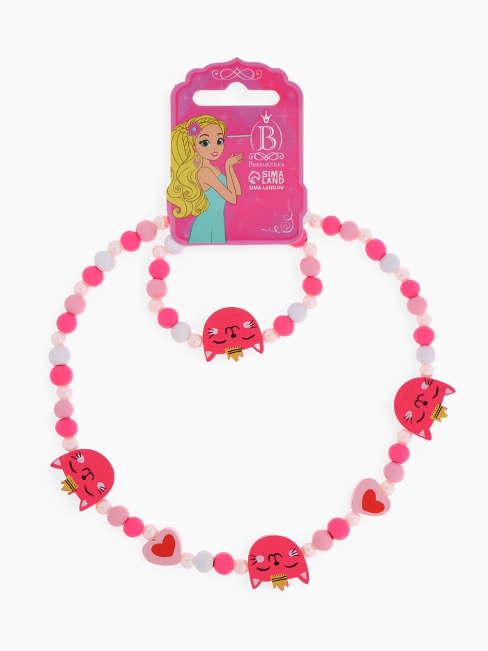 Набор детский «Выбражулька» 2 предмета: бусы, браслет, кошечка в короне, красно-розовый — Характеристики