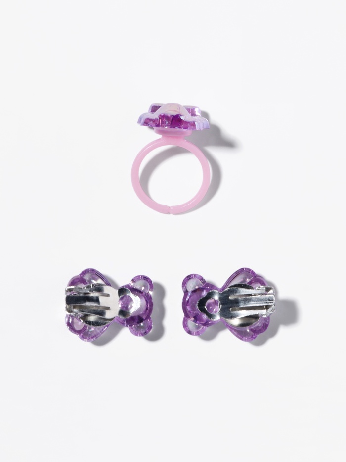 Подарите вашей маленькой моднице возможность выразить свою индивидуальность с этим очаровательным набором, включающим клипсы и кольцо с милым мишкой! Эти аксессуары в фиолетовом цвете добавят ярких акцентов в любой наряд и сделают каждый день особенным.