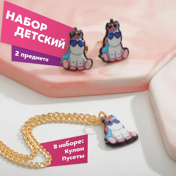 Набор детский «Выбражулька» 2 предмета: пусеты, кулон, единорог в очках, цветной — Характеристики