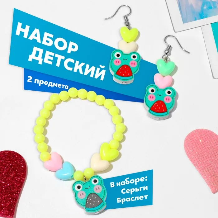 Набор детский «Выбражулька» 2 предмета: серьги, браслет d=5 см. лягушки, МИКС — Характеристики