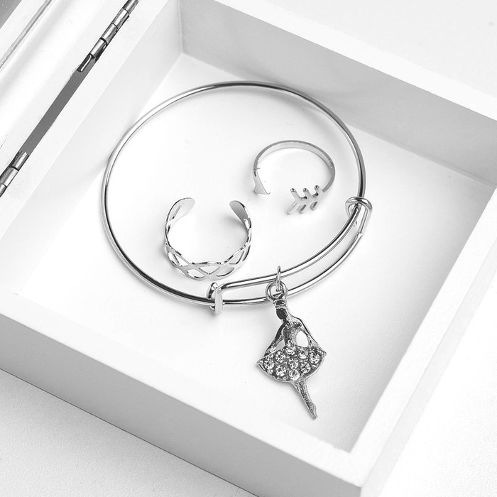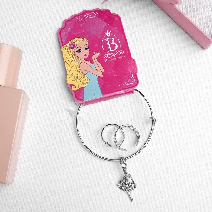 Набор детский «Выбражулька» 3 предмета: браслет d=5 см. 2 кольца, балерина, серебристый