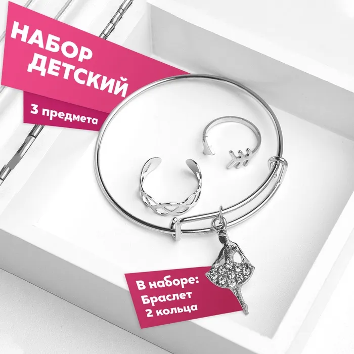 Набор детский «Выбражулька» 3 предмета: браслет d=5 см. 2 кольца, балерина, серебристый — Характеристики