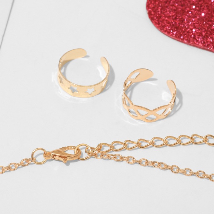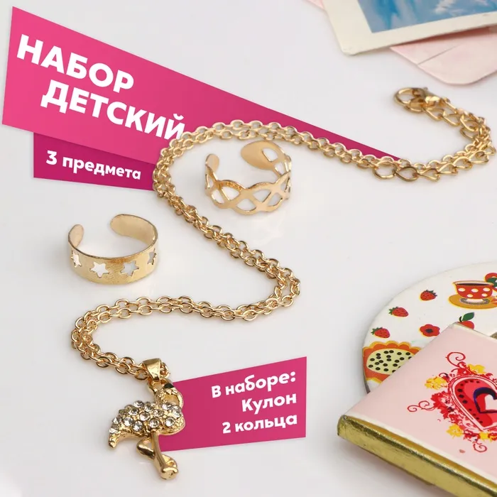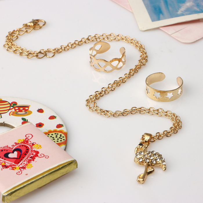 Набор детский «Выбражулька» 3 предмета: кулон 40 см, 2 кольца, фламинго, белый в золоте — Характеристики