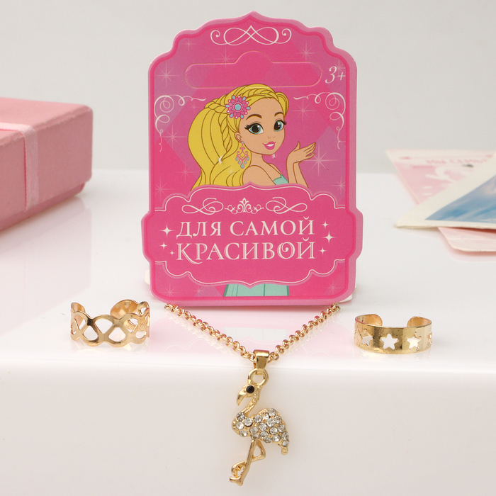 Набор детский «Выбражулька» 3 предмета: кулон 40 см, 2 кольца, фламинго, белый в золоте