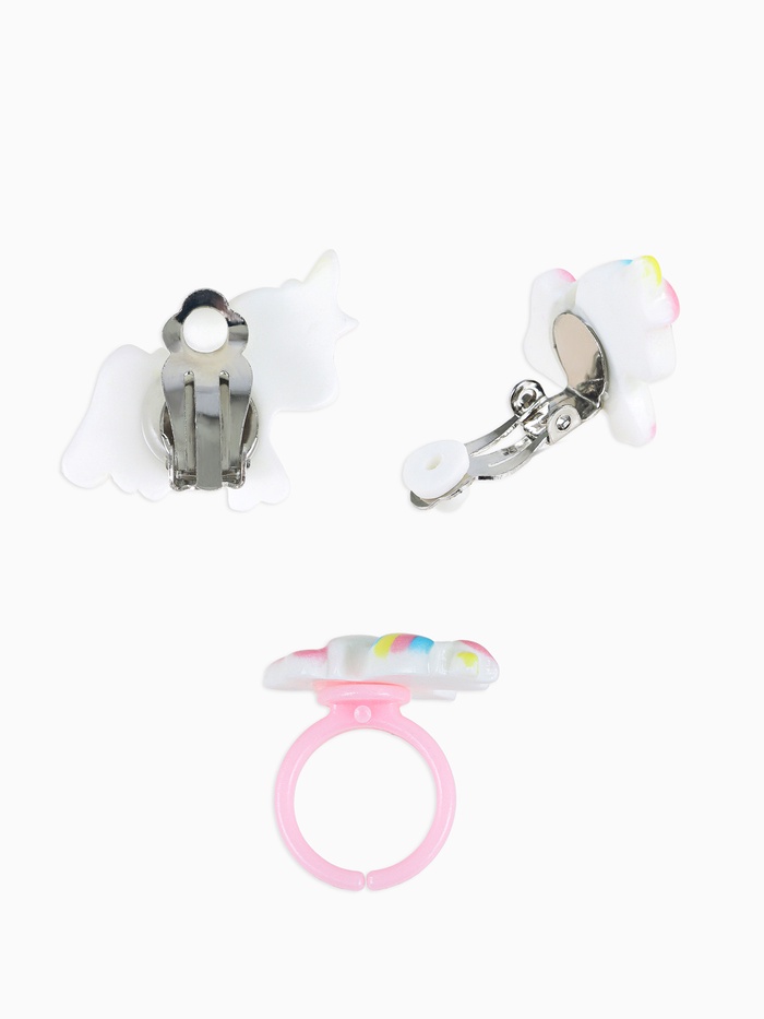 В комплекте представлены клипсы, браслет диаметром 5 см и кольцо, созданные из экологически чистого пластика, безопасные и удобные в обращении. Уникальный дизайн украшений дополнен элементами пластикового декора, подчеркивающим волшебный и мечтательный характер единорога.