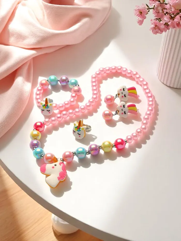 В состав набора входит кулон, браслет, кольцо и клипсы, выполненные из безопасного пластика с насыщенными розовыми и разноцветными оттенками. Такой дизайн не только радует глаз, но и легко сочетается с разными нарядами, позволяя создавать уникальные образы для прогулок, праздников или повседневных приключений.