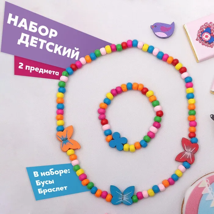 Набор детских украшений Выбражулька «Нежность бабочки», 2 предмета: бусы, браслет d=4.6 см разноцветный — Характеристики