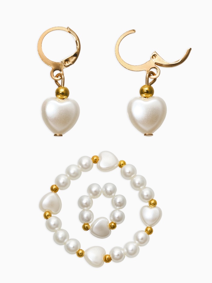 Создайте уникальный образ для вашей маленькой модницы с набором украшений "Выбражулька. Стиль в сердце". В комплект входят прекрасные аксессуары — белые бусы, изящный браслет, очаровательное кольцо и милые клипсы, выполненные в теплой золотистой гамме.