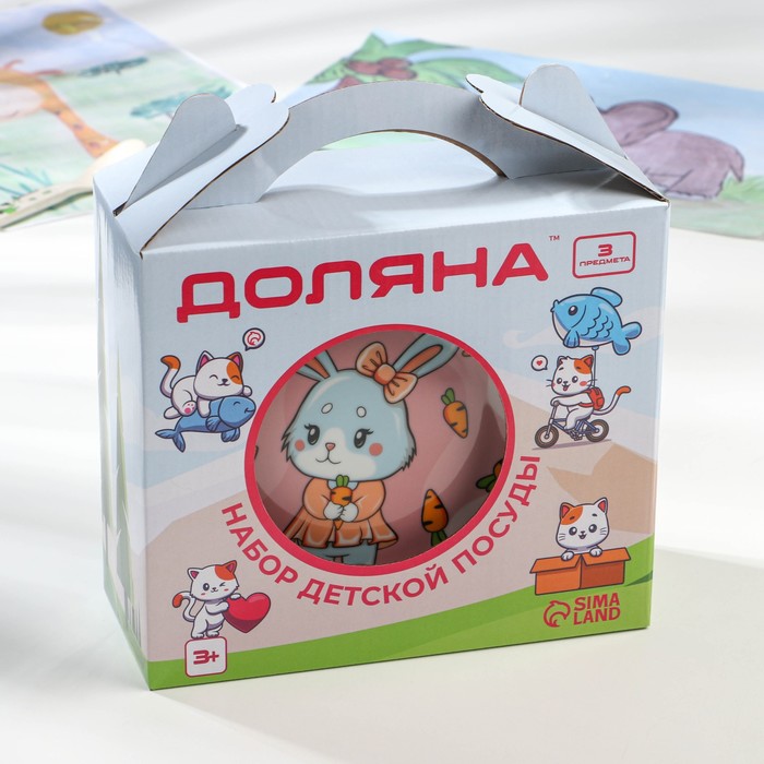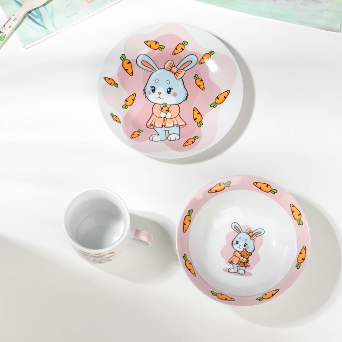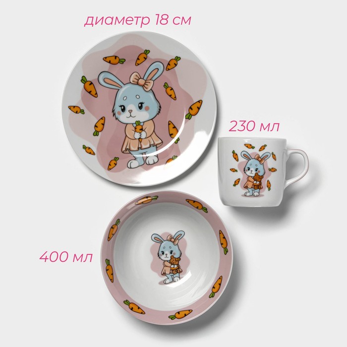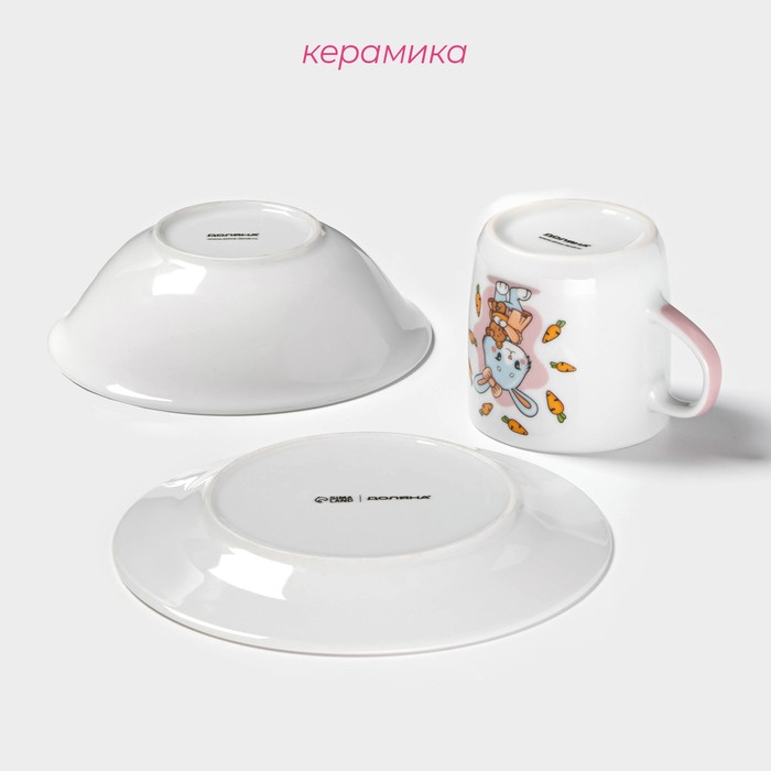 Набор детской посуды Доляна «Лапочка зайка», 3 предмета: кружка 230 мл, миска 400 мл, тарелка d=18 см, керамика, белый