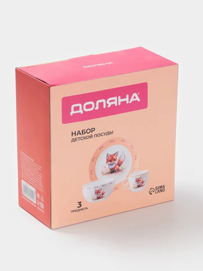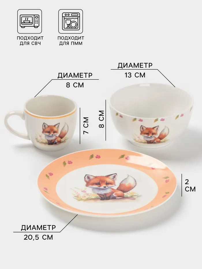 Набор детской посуды Доляна «Лисенок», 3 предмета: кружка 200 мл, миска 600 мл, тарелка d=20.5 см, фарфор, оранжевый — Характеристики