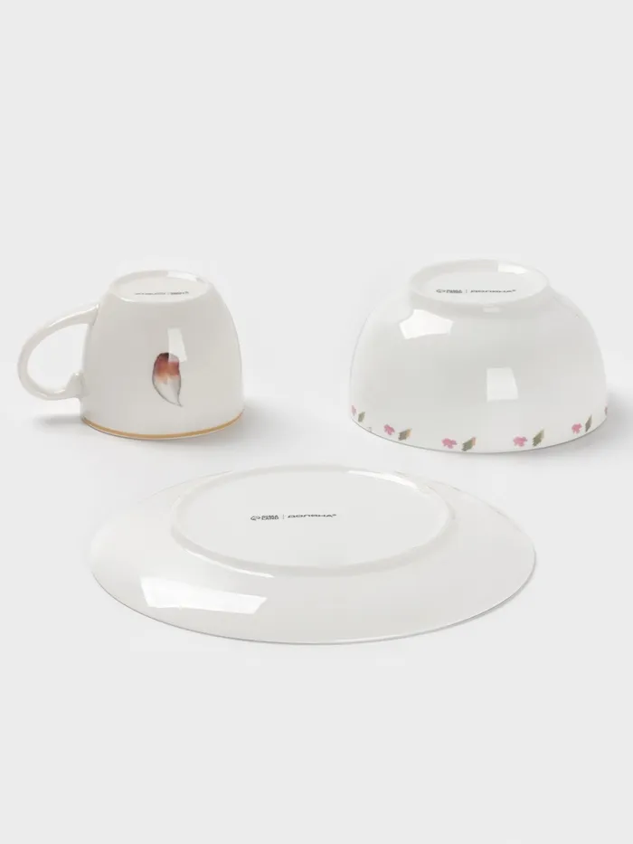 Детский набор "Лисенок" включает в себя кружку, миску и тарелку, оформленные в ярких оранжевых и белых тонах. Фарфор высокого качества позволяет использовать посуду в микроволновой печи и мыть в посудомоечной машине, что облегчает жизнь родителям. Поставляется в красивой картонной коробке.
