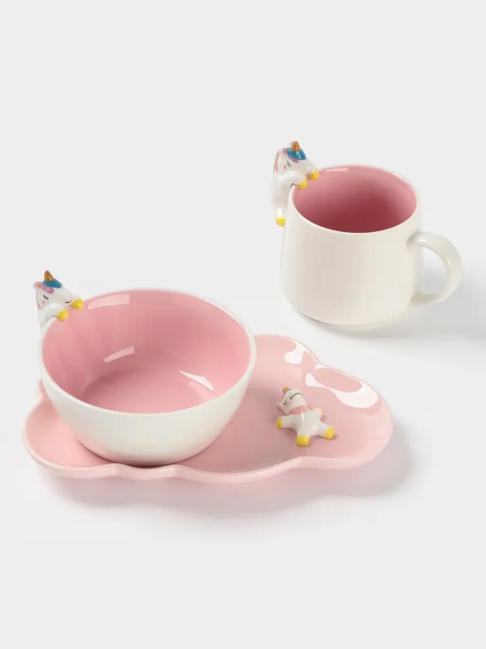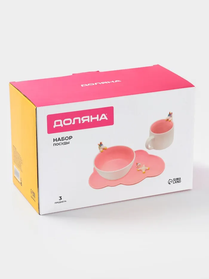 Набор детской посуды Доляна «Радужный единорог», 3 предмета: кружка 350 мл, супница 450 мл, тарелка, керамика, розовый — Характеристики
