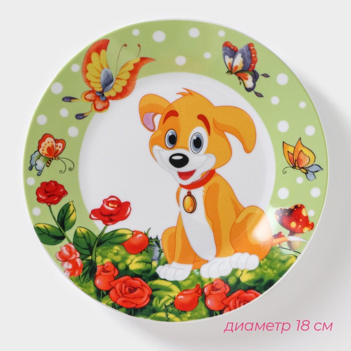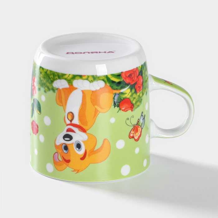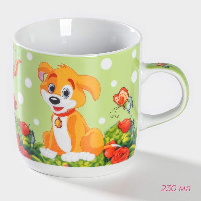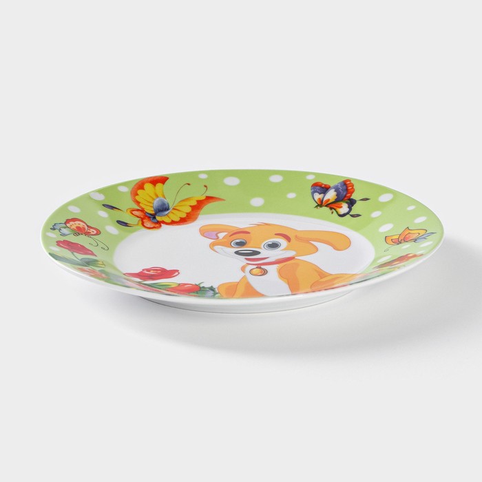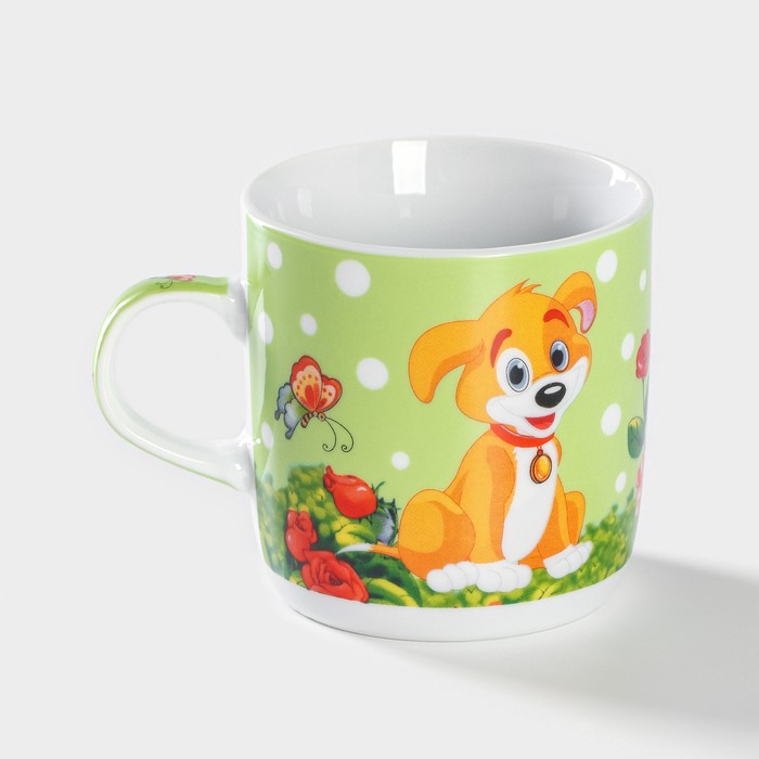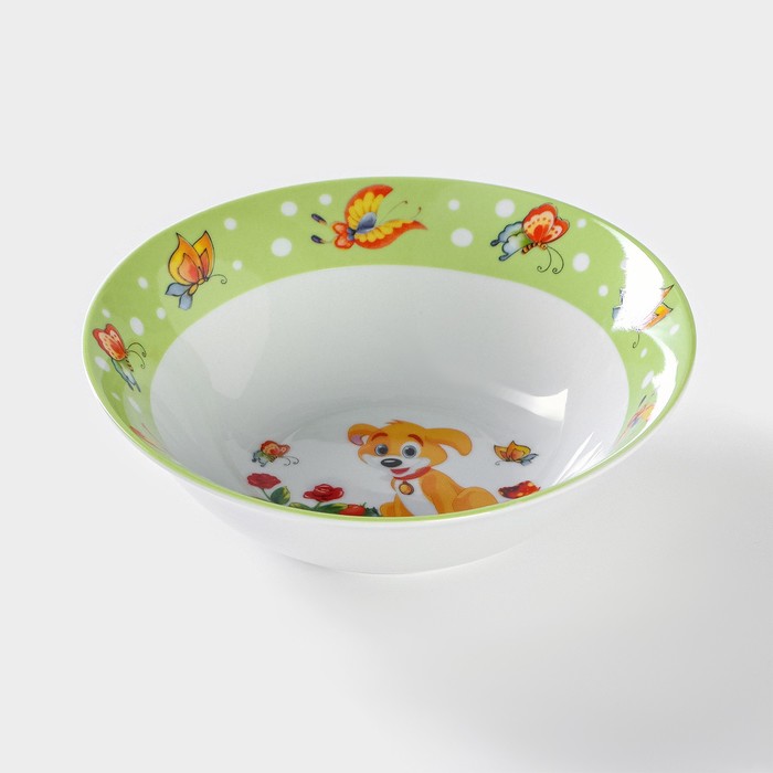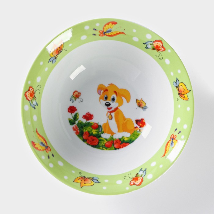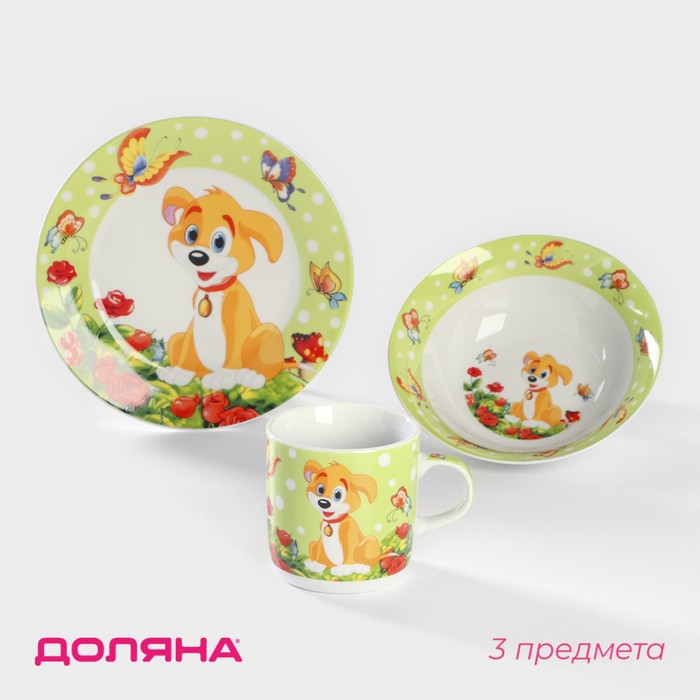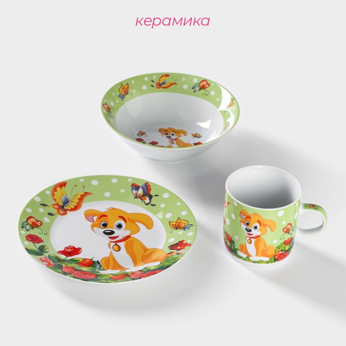 Набор детской посуды Доляна «Щенок», 3 предмета: кружка 230 мл, миска 400 мл, тарелка d=18 см, керамика, белый, зелёный — Характеристики