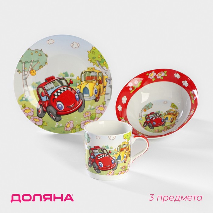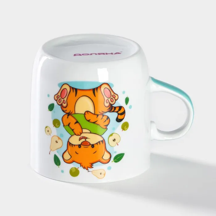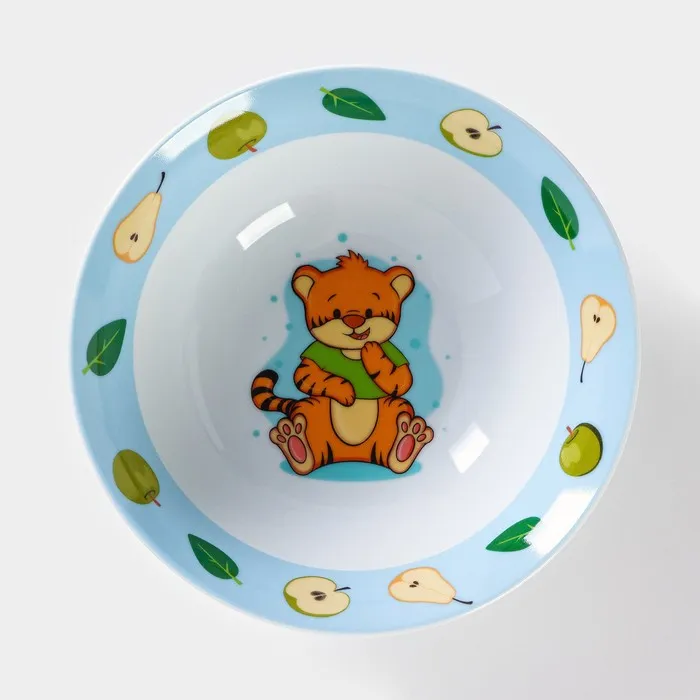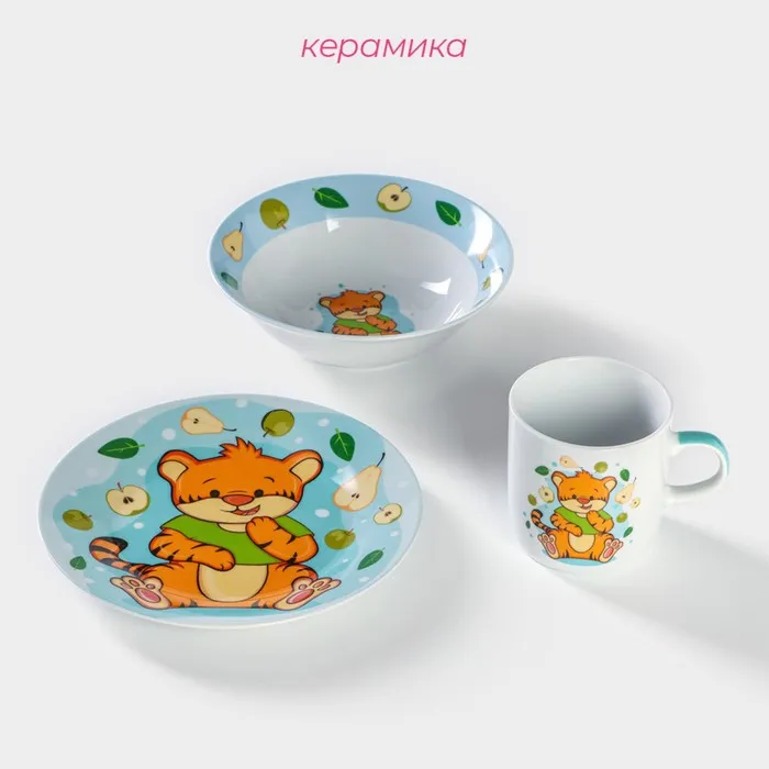 Набор детской посуды Доляна «Тигрёнок с грушами», 3 предмета: кружка 230 мл, миска 400 мл, тарелка d=18 см, керамика, белый, голубой
