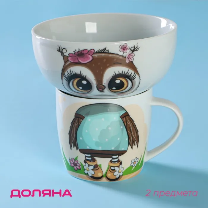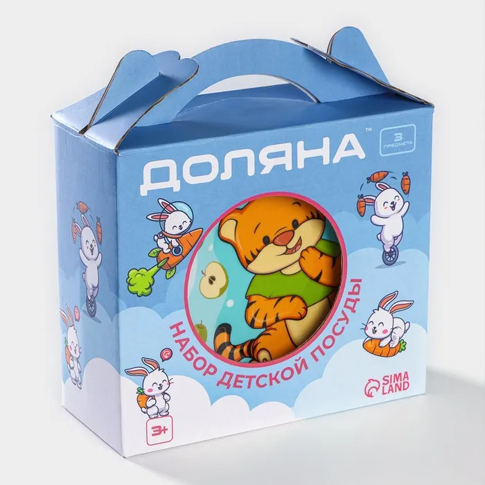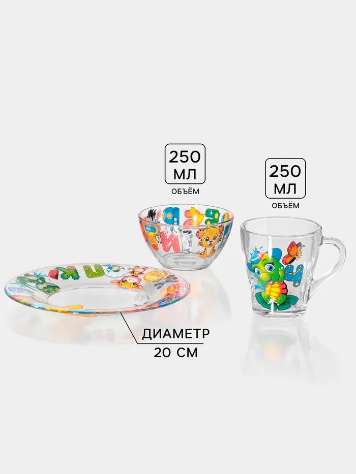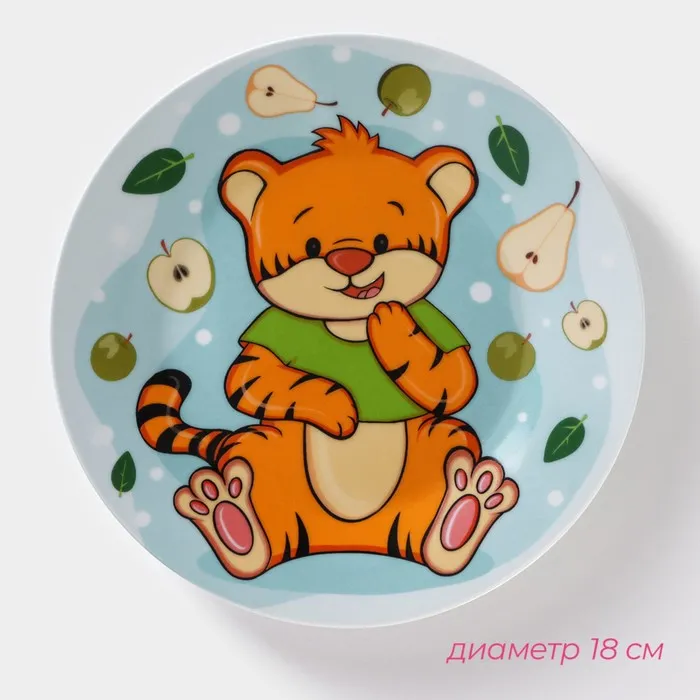 Набор детской посуды Доляна «Тигрёнок с грушами», 3 предмета: кружка 230 мл, миска 400 мл, тарелка d=18 см, керамика, белый, голубой — Характеристики