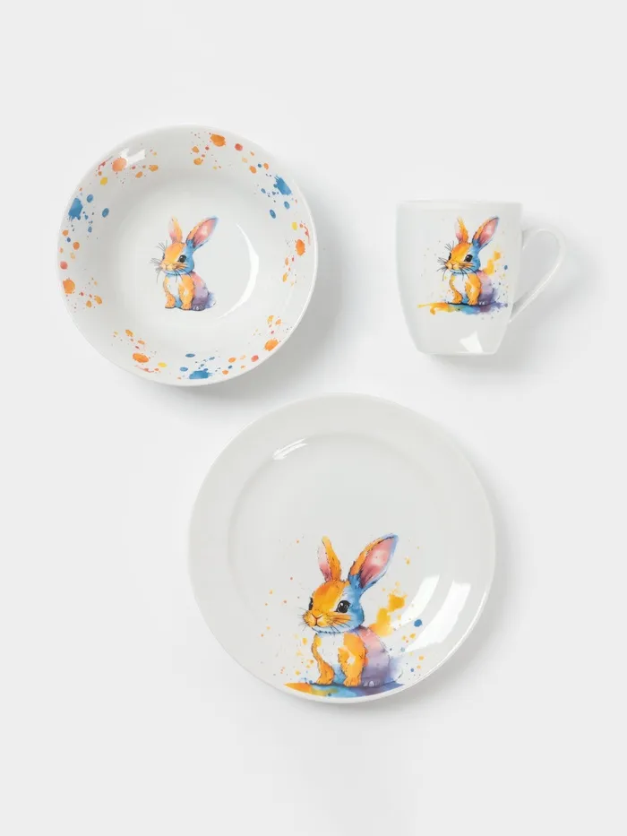 Этот набор создан для реальной жизни. Тарелка подходит для порций каши или салата, миска идеально справляется с первыми блюдами, а кружка удобна для горячих напитков. Белый цвет подчеркнёт любую сервировку, а "зайчик" на поверхности добавит нотку радости и тепла.