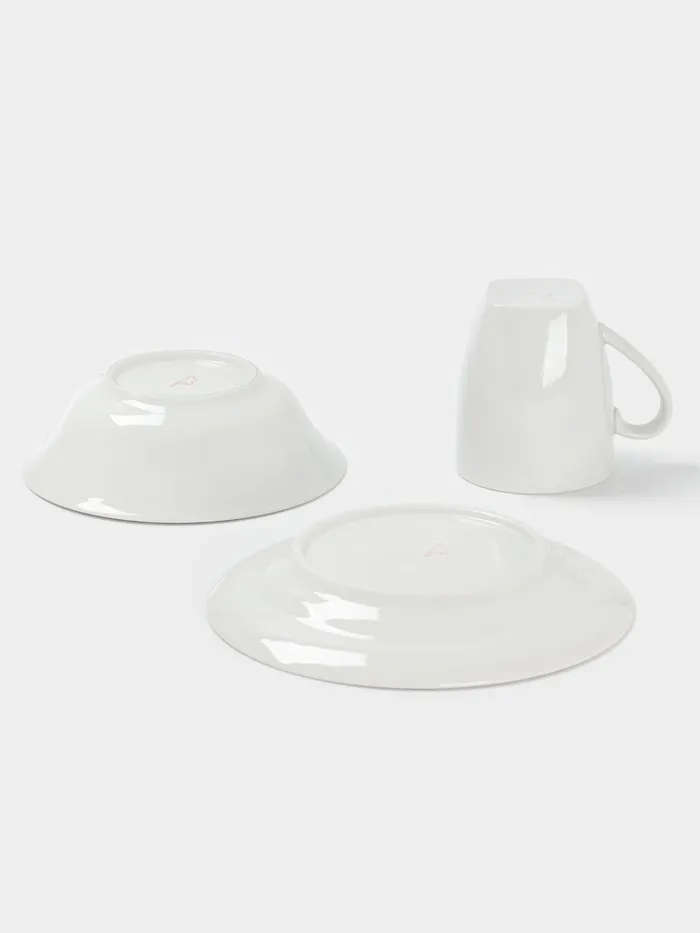 - Комплект из трёх предметов: тарелка, миска и кружка — всё необходимое для завтраков, обедов и ужинов.