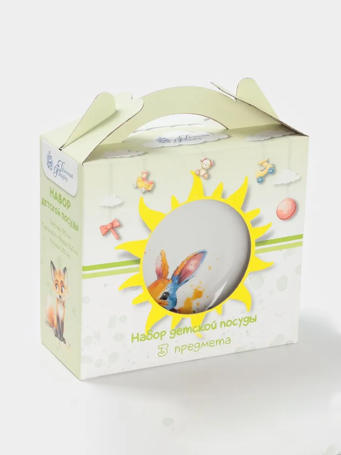 Набор детской посуды с зайчиком из дулевского фарфора — это практичный и стильный выбор для повседневных трапез. Подходит для детей старше трёх лет, он включает тарелку (175 мл), миску (360 мл) и кружку (210 мл). Белый цвет и очаровательный рисунок делают этот комплект универсальным и привлекательным для ежедневного использования.
