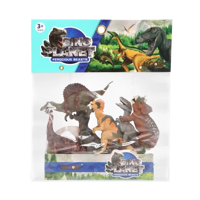 - 6 фигурок динозавров из юрского периода, включая такие виды, как велоцирaptor, стегозавр, трицератопс и другие.
