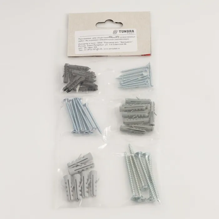 Для домашнего мастера: Набор избавляет от необходимости подбирать крепёжные элементы отдельно. Все компоненты хранятся в одной упаковке — вы всегда найдёте нужный дюбель и подходящий к нему саморез. Комплект экономит время и упрощает организацию ремонтных работ.