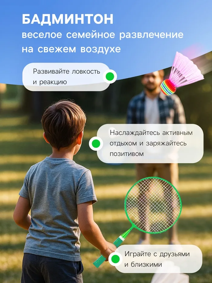Бадминтон — весёлое летнее развлечение. Возьмите на прогулку полный комплект для увлекательного и активного досуга на свежем воздухе.