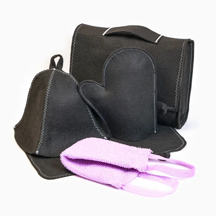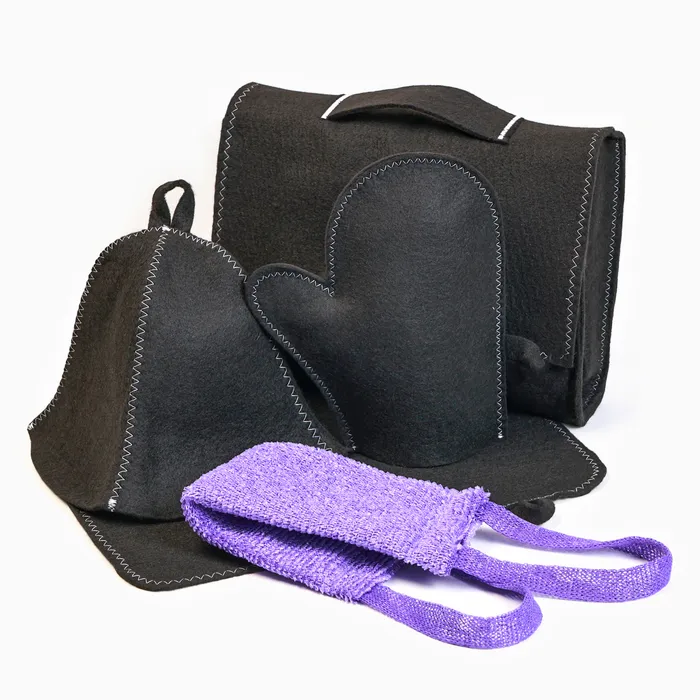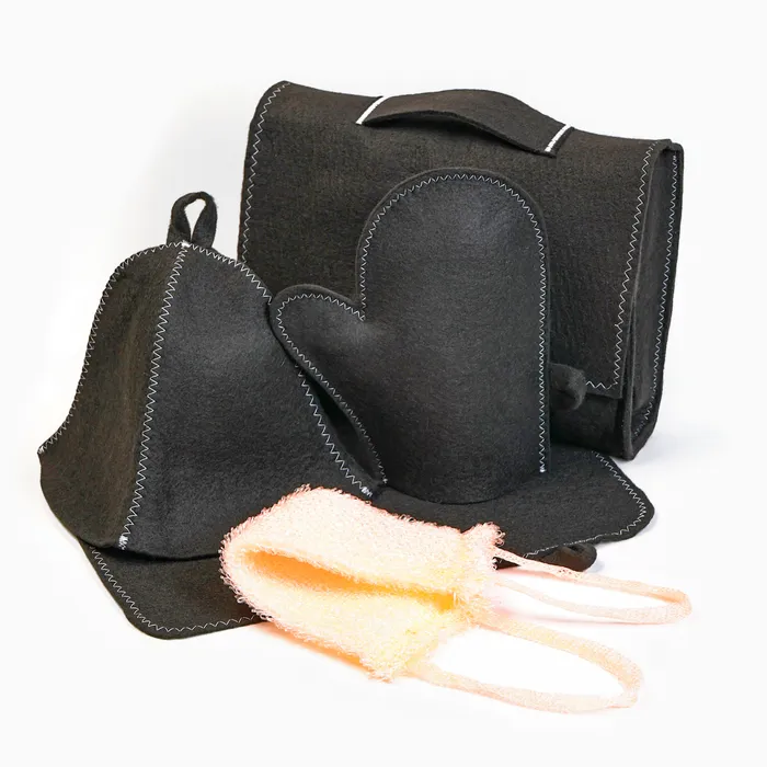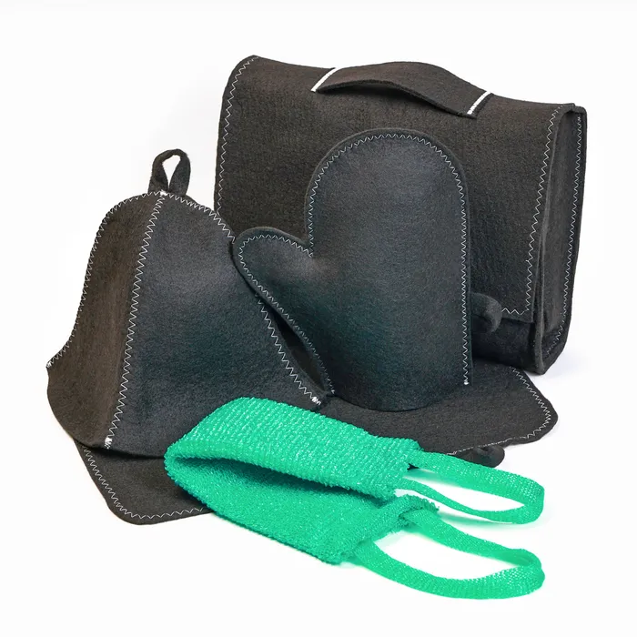 Для комфортного отдыха в парной возьмите с собой набор банных принадлежностей. Предметы из этого комплекта предохраняют тело от перегрева и являются средствами индивидуального пользования. Влажные изделия рекомендуется сушить в расправленном виде на горизонтальной поверхности. Принадлежности из войлока и фетра стирайте вручную при температуре воды 30 °C.