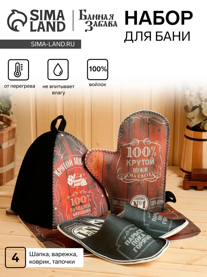 Набор для бани с принтом «Крутой мужик», 4 предмета: шапка, рукавица, тапочки, коврик, войлок, тёмный, «Банная забава»