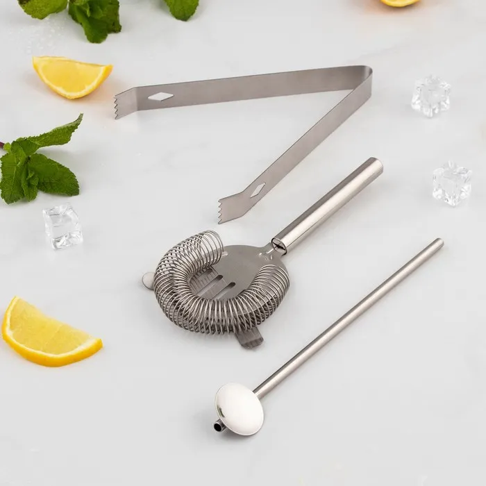 - стрейнер — инструмент бармена, предназначенный для отсеивания крупных частиц (лёд или кусочки фруктов) при переливании коктейля из шейкера в бокал;