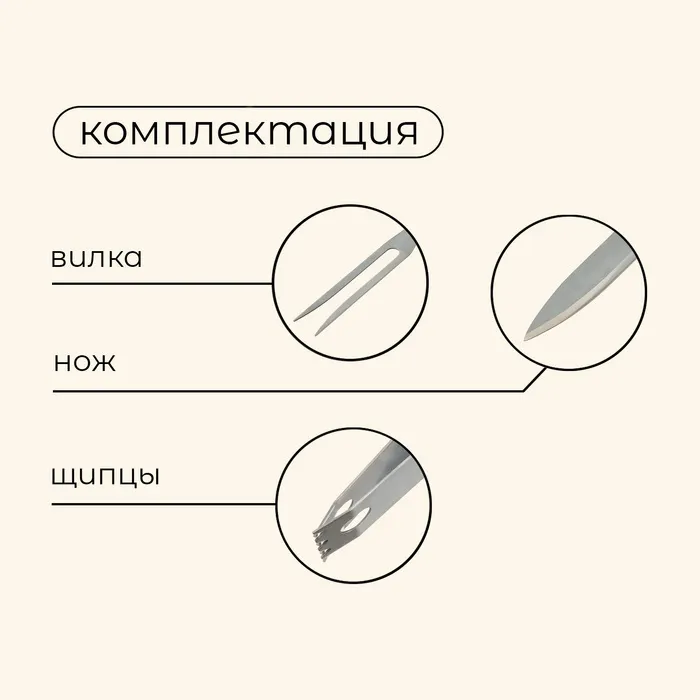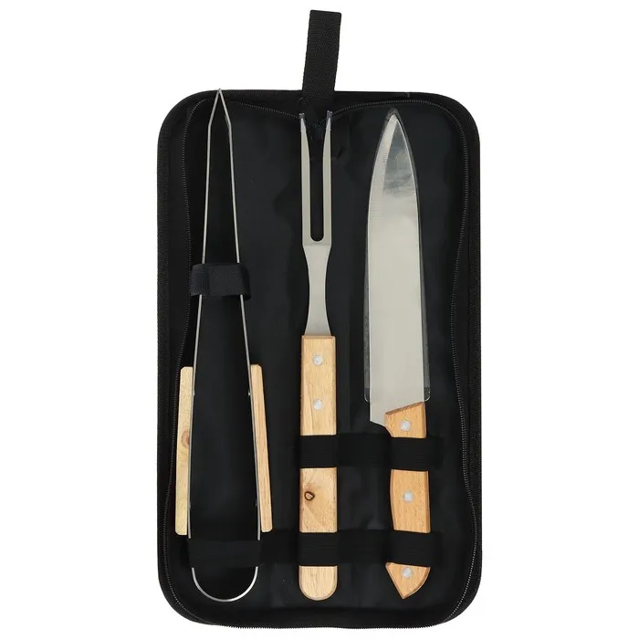В набор входит всё необходимое для приготовления пищи на гриле или барбекю. В комплекте есть вилка для мяса, нож, щипцы и чехол для хранения и переноски. Рабочая поверхность приборов выполнена из нержавеющей стали, ручки — из дерева.