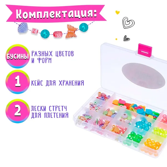 - С помощью набора можно сплести браслеты, ожерелья и другие аксессуары. Эластичная леска упрощает процесс работы, делая его доступным даже для начинающих.