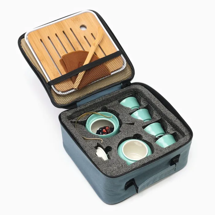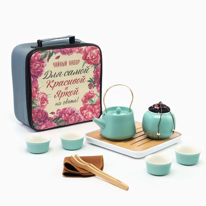 Портативный чайный набор, благодаря компактной сумке с ручкой, удобно брать с собой на природу, в гости, на дачу. Посуда подходит как для торжественных чайных церемоний, так и для повседневного домашнего использования. Изделие изготовлено из прочной керамики, а крышка соединена с ручкой с помощью веревки, чтобы избежать падения.