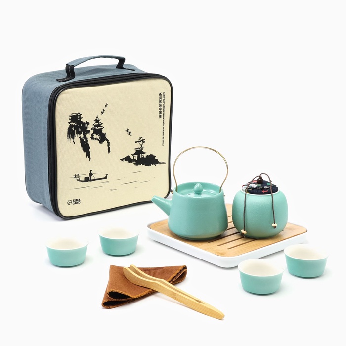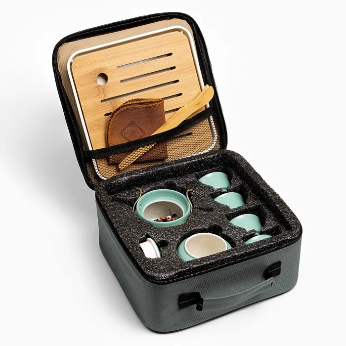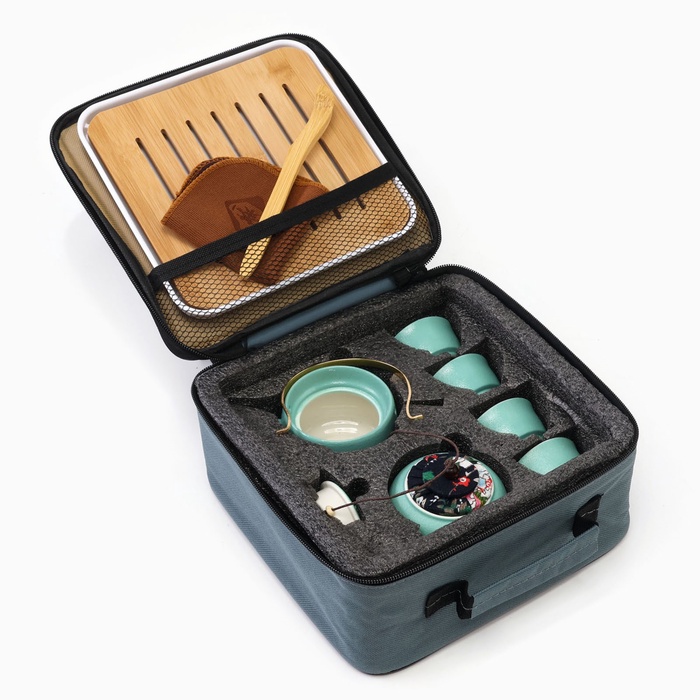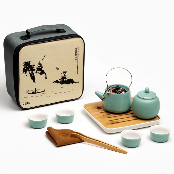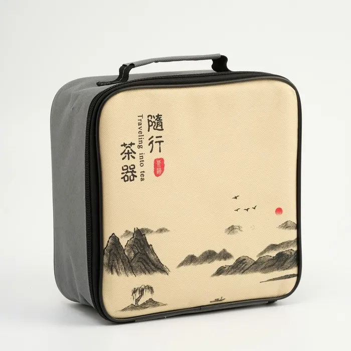 Портативный чайный набор, благодаря компактной сумке с ручкой, удобно брать с собой на природу, в гости, на дачу. Посуда подходит как для торжественных чайных церемоний, так и для повседневного домашнего использования. Изделие изготовлено из прочной керамики, а крышка соединена с ручкой с помощью веревки, чтобы избежать падения.