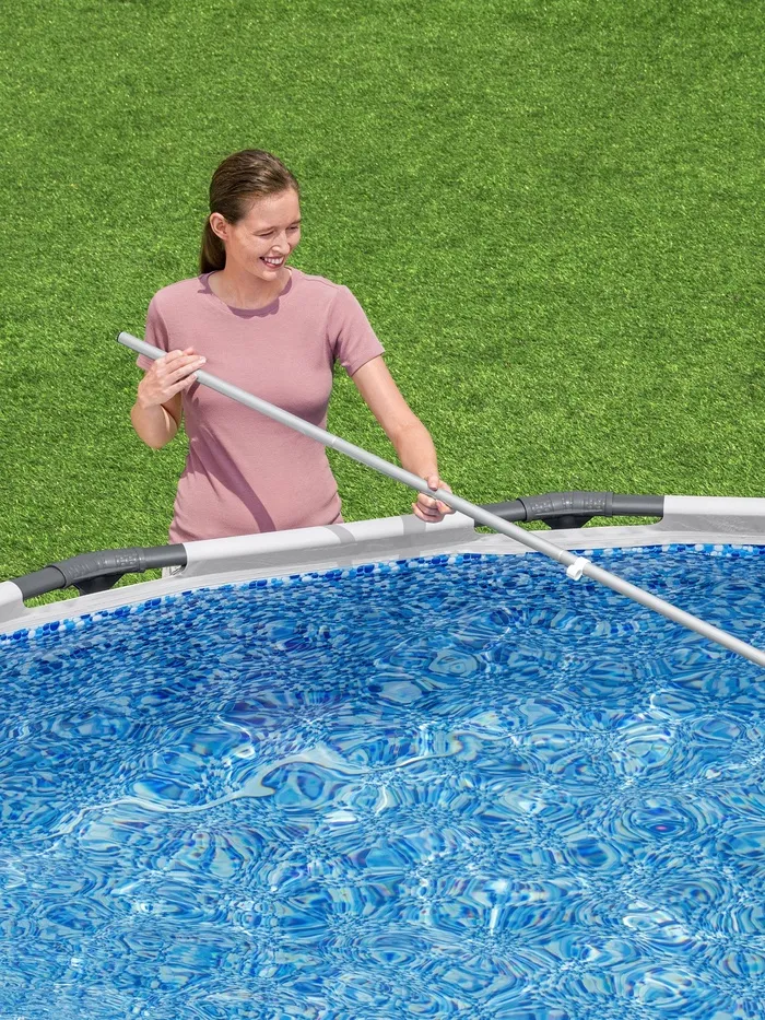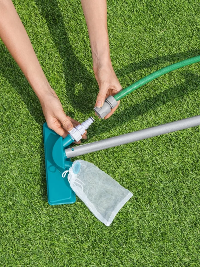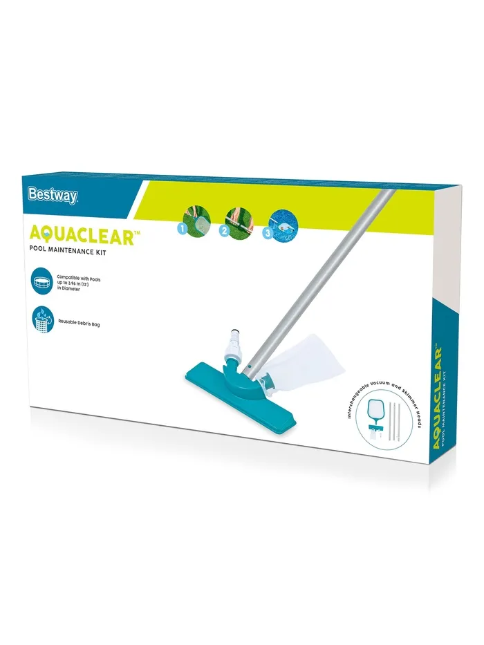 Набор для очистки бассейнов — это необходимый инвентарь, который должен быть у каждого обладателя каркасного или надувного бассейна. С ним вы затратите меньше сил и времени на очистку, а сам процесс пройдёт легко и приятно. Набор состоит из алюминиевой телескопической трубки, с помощью которой вы сможете достать даже до самого дальнего угла бассейна, вакуумной щётки с прозрачным сетчатым мешочком для сбора мусора под водой, а также сачка для улавливания крупного плавающего мусора, например листьев, травы и прочего.