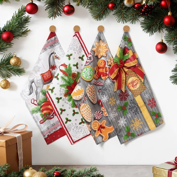 Набор новогодних кухонных полотенец Доляна «Подарок » 35х60см-4 штуки, 100% хлопок