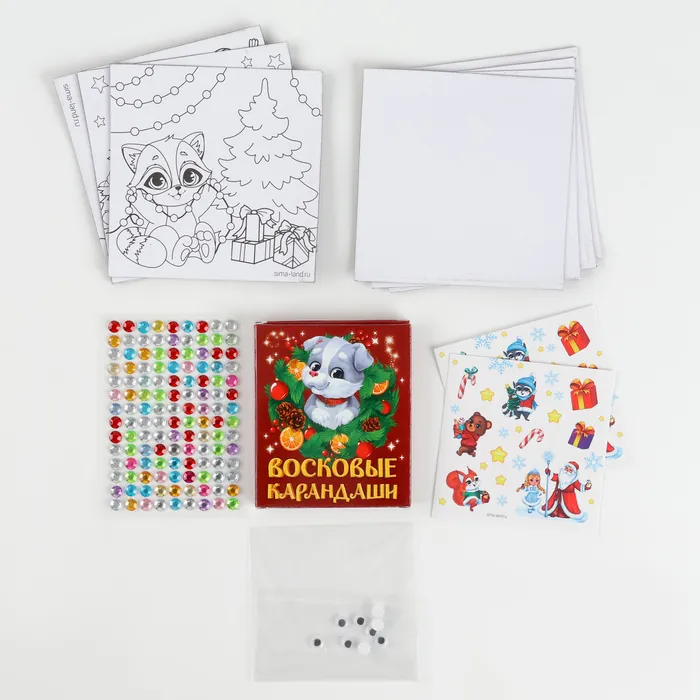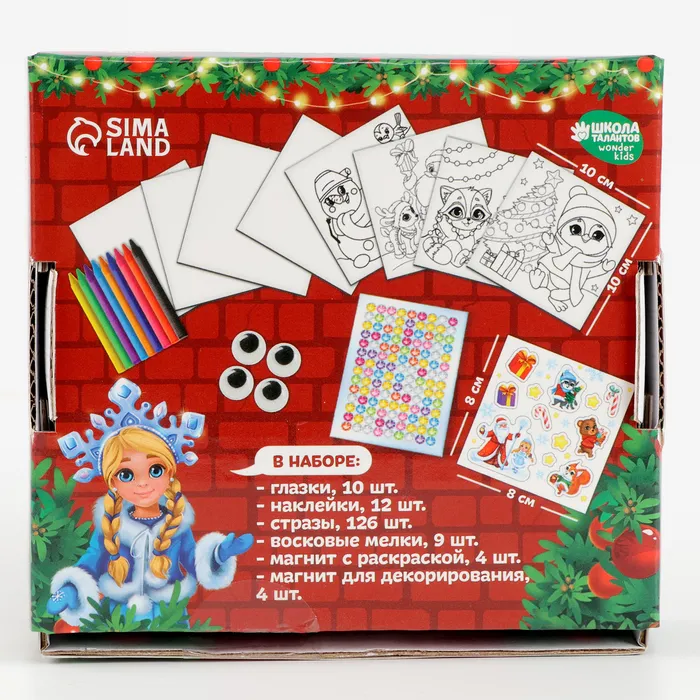 4 магнитные заготовки 10 х 10 см с рисунком4 магнитные заготовки 10 х 10 см без рисунканаклейкистразыпластиковые глазкивосковые мелки 9 штНаслаждайтесь творчеством и создавайте уникальные яркие картинки.